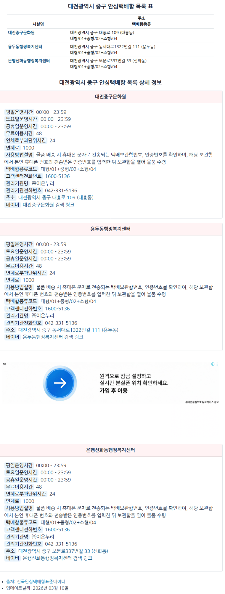 대전 중구에 무인 안심택배함 3곳 운영하고 있습니다